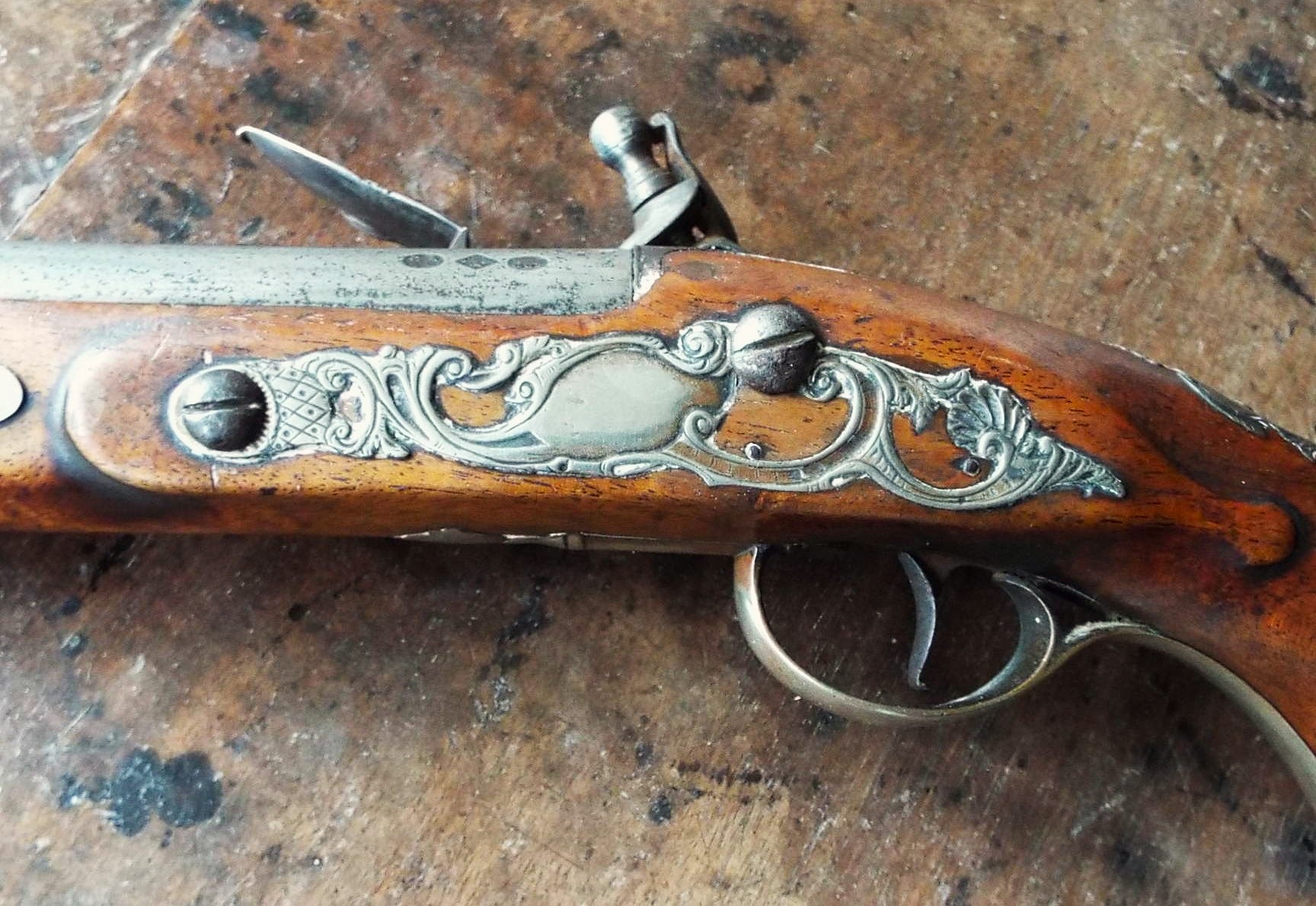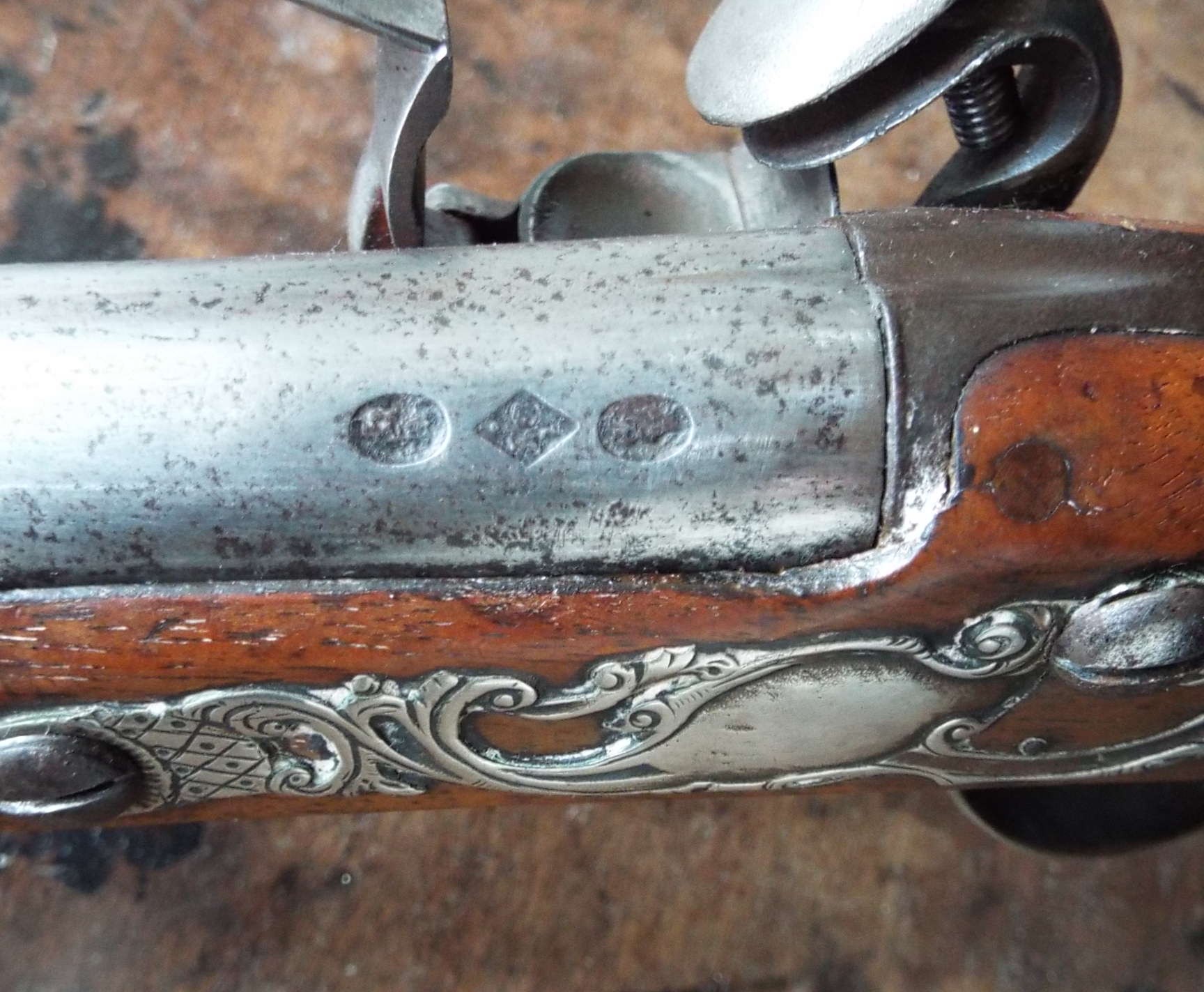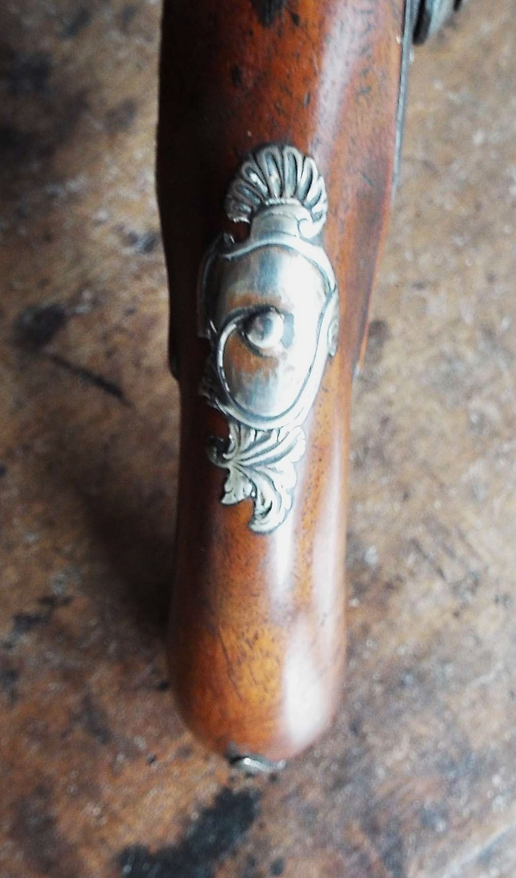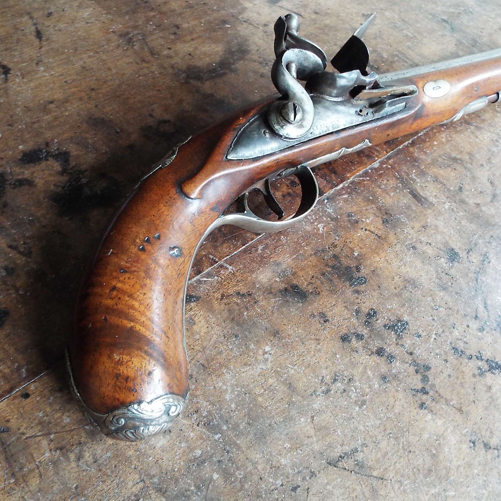 A good late 18th century silver mounted, flintlock horse or holster pistol by Clarkson. Full light coloured walnut stock ( original colour shows little use ) 16 inches overall with a 10 inch, swamped 18 bore, steel barrel. The mounts of un-hallmarked sliver. Crisp working action. A nice pistol, shows very little ware, no splits to the stock and the mounts are in very good order.