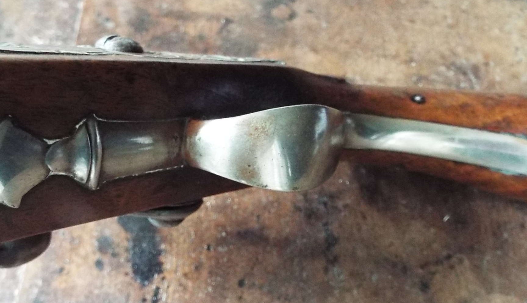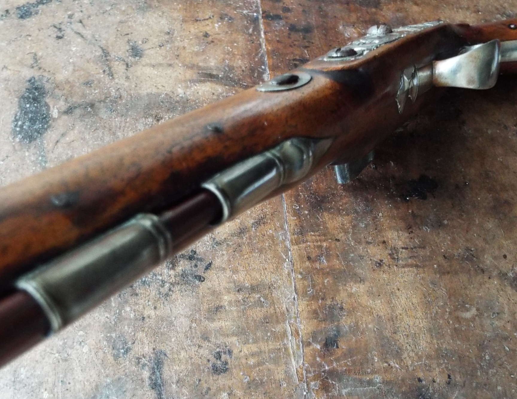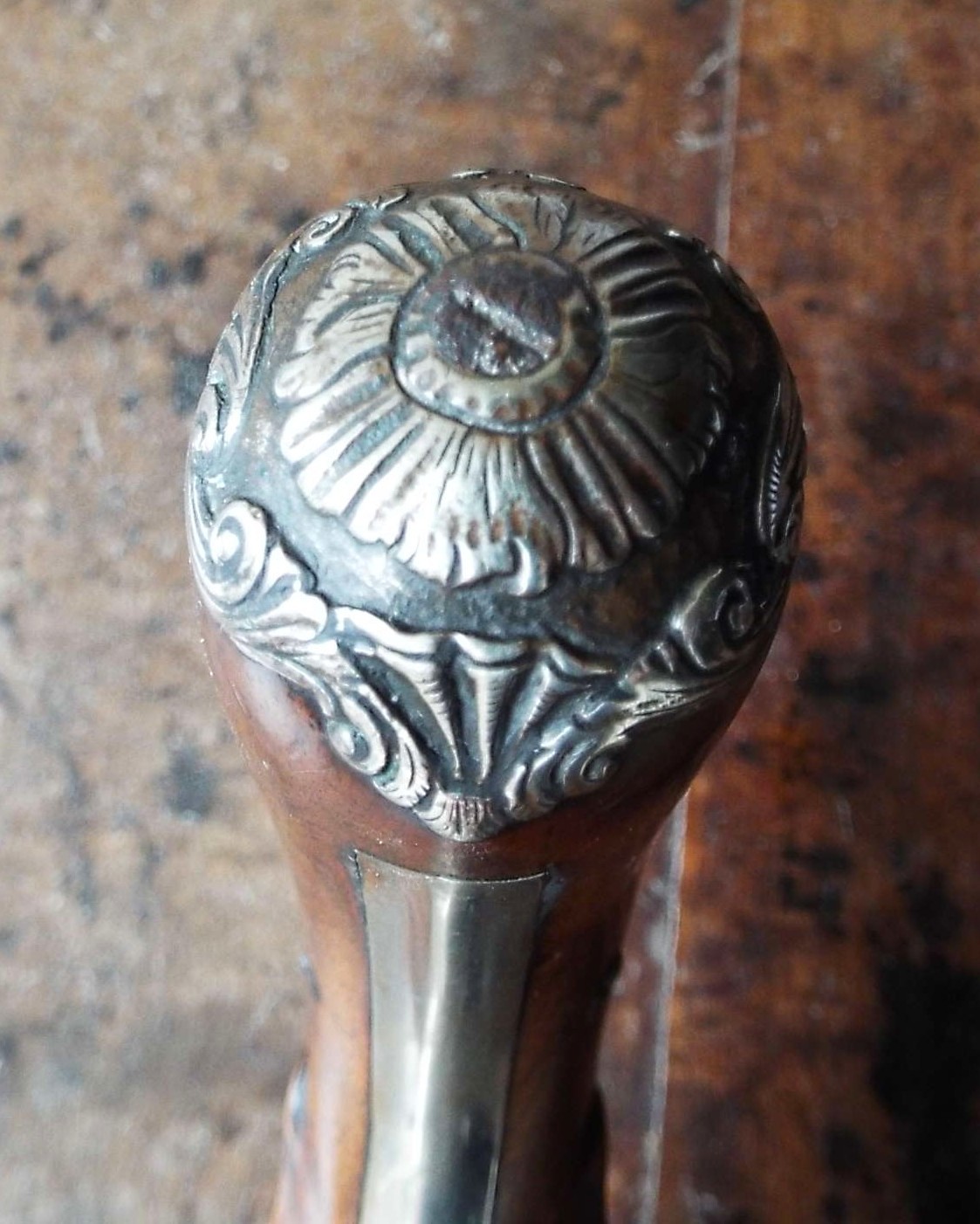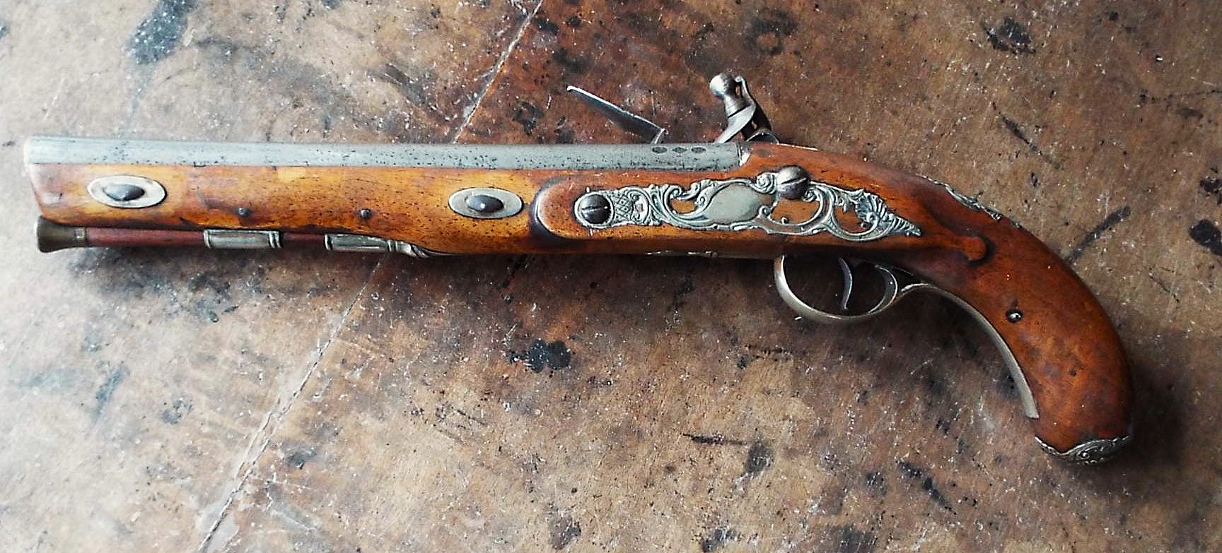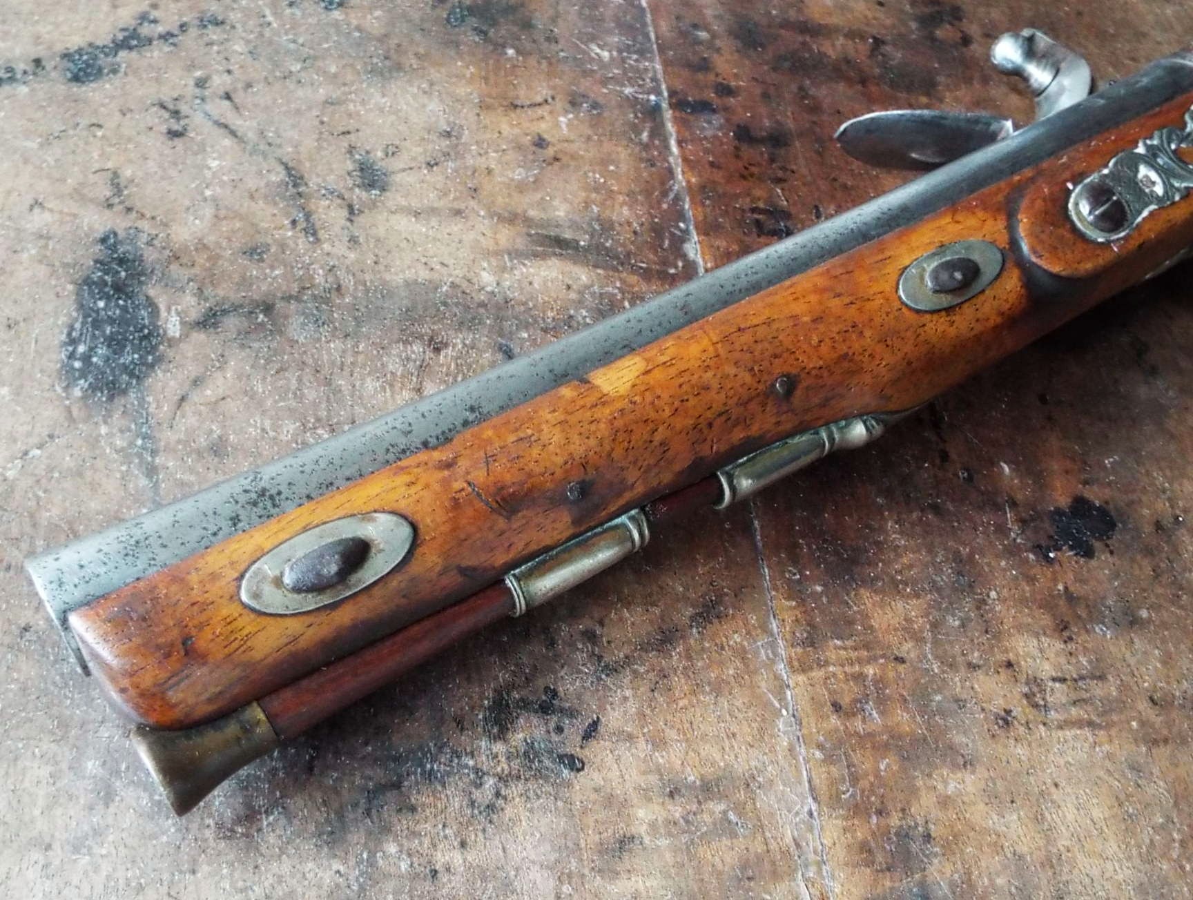 A good late 18th century silver mounted, flintlock horse or holster pistol by Clarkson. Full light coloured walnut stock ( original colour shows little use ) 16 inches overall with a 10 inch, swamped 18 bore, steel barrel. The mounts of un-hallmarked sliver. Crisp working action. A nice pistol, shows very little ware, no splits to the stock and the mounts are in very good order.